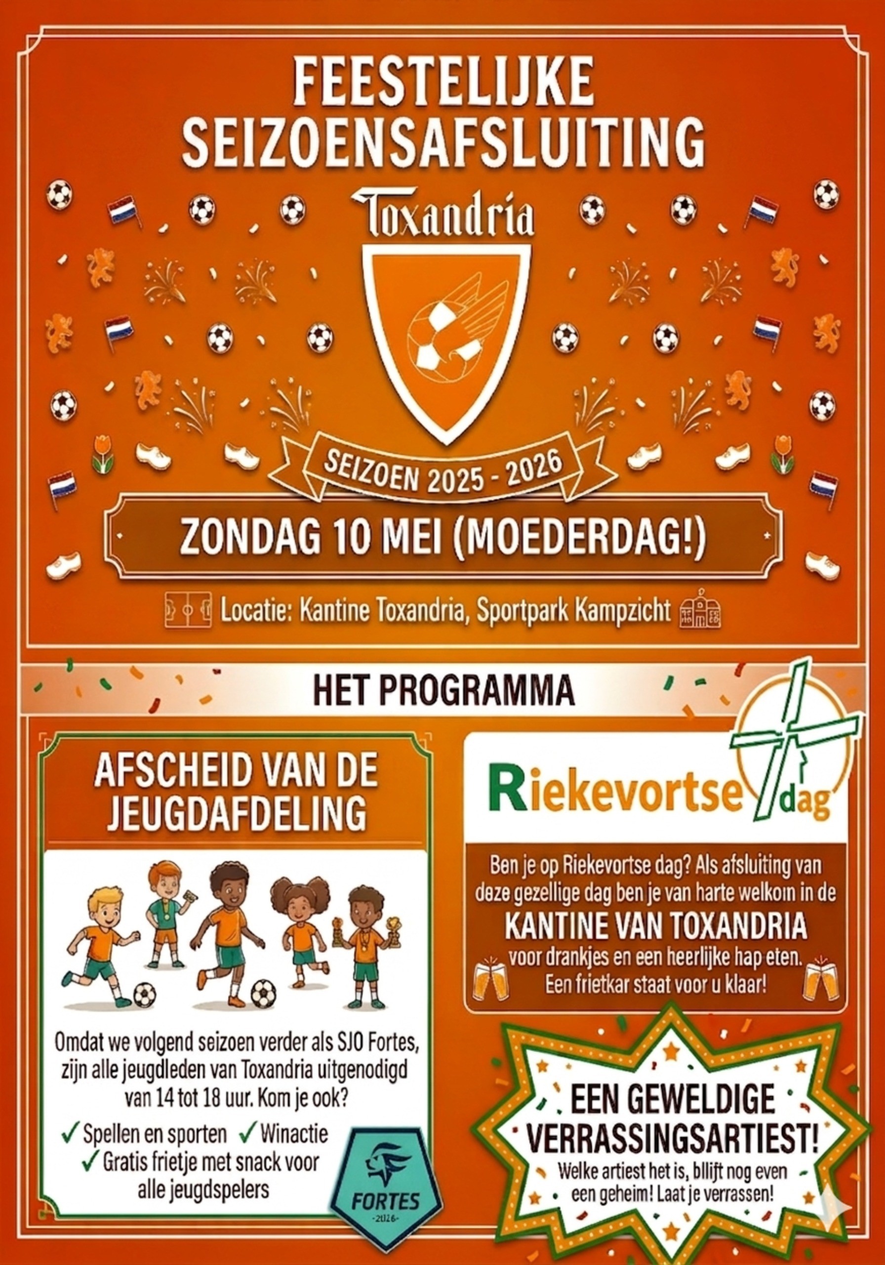 Zondag 10 mei spelen alle seniorenteams hun laatste thuiswedstrijd van het seizoen op Kampzicht (op een inhaalduel van Ut Twed na). Het seizoen 2025-2026 zit er daarmee dan weer bijna op en zoals het een échte Toxandriaan betaamt, is dat een bijzonder goede reden voor een gezellig feestje.