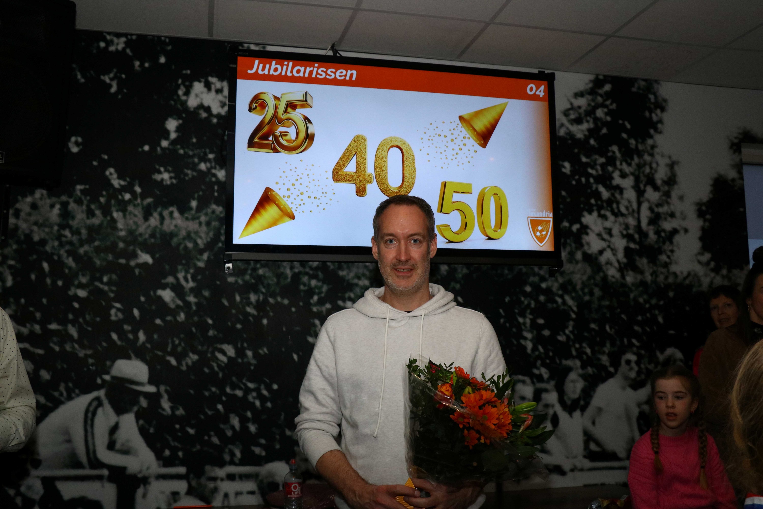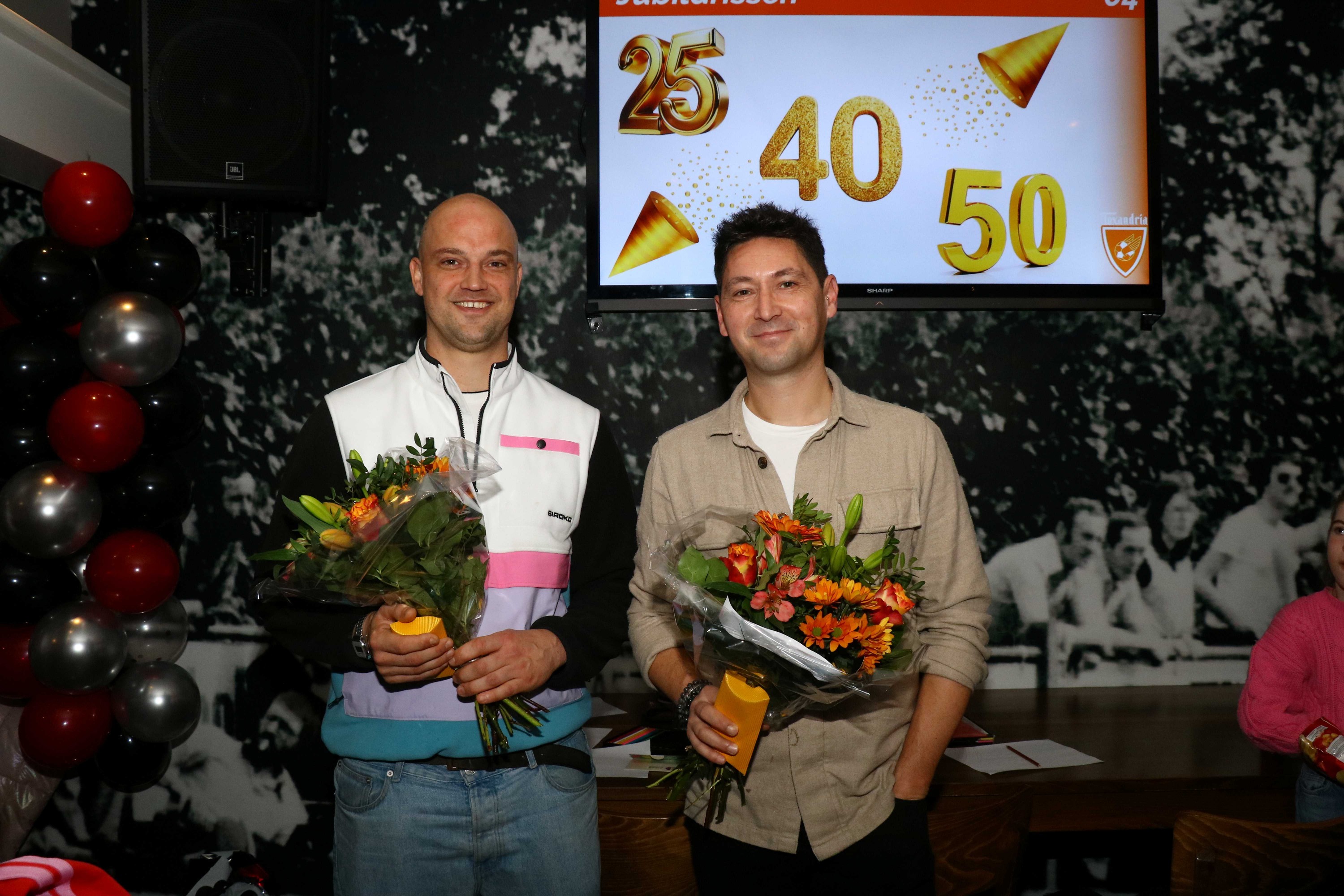 In de categorie 25 jaar mochten drie leden de bloemen en felicitaties in ontvangst nemen. Alex van Elsen belandde een kwart eeuw geleden na een opleiding bij Olympia ’18 bij zijn vrienden in Rijkevoort bij Toxandria. Jarenlang speelde hij als technisch vaardige middenvelder in Toxandria 1. Tegenwoordig is Alex nog wekelijks -ijs en weder dienende- bij de Veteranen te bewonderen.